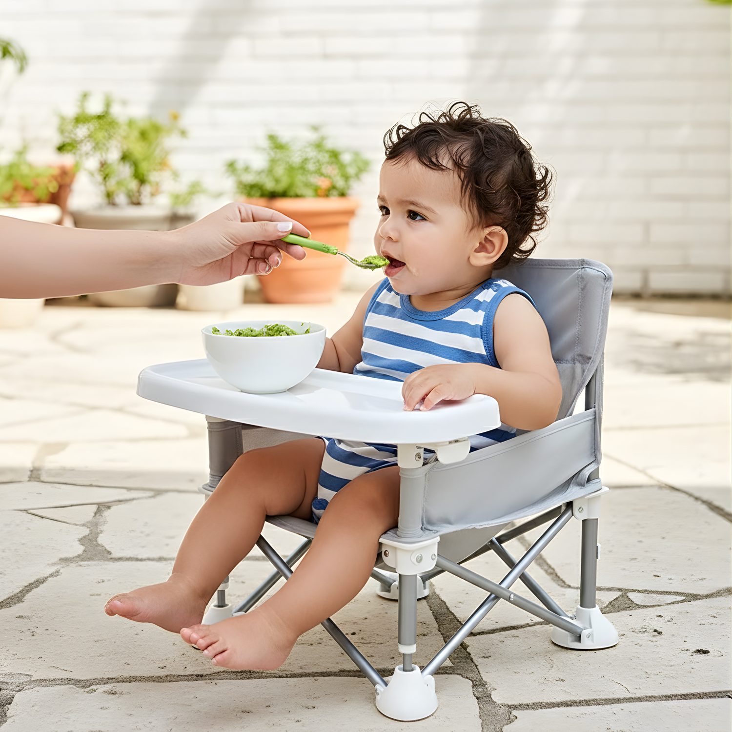 La silla está diseñada para bebés y niños pequeños de 3 a 36 meses. Su estructura metálica robusta y el cinturón de seguridad garantizan un soporte firme durante esta etapa de crecimiento, adaptándose perfectamente tanto para el inicio de la alimentación complementaria como para su uso recreativo en la playa o jardín.
