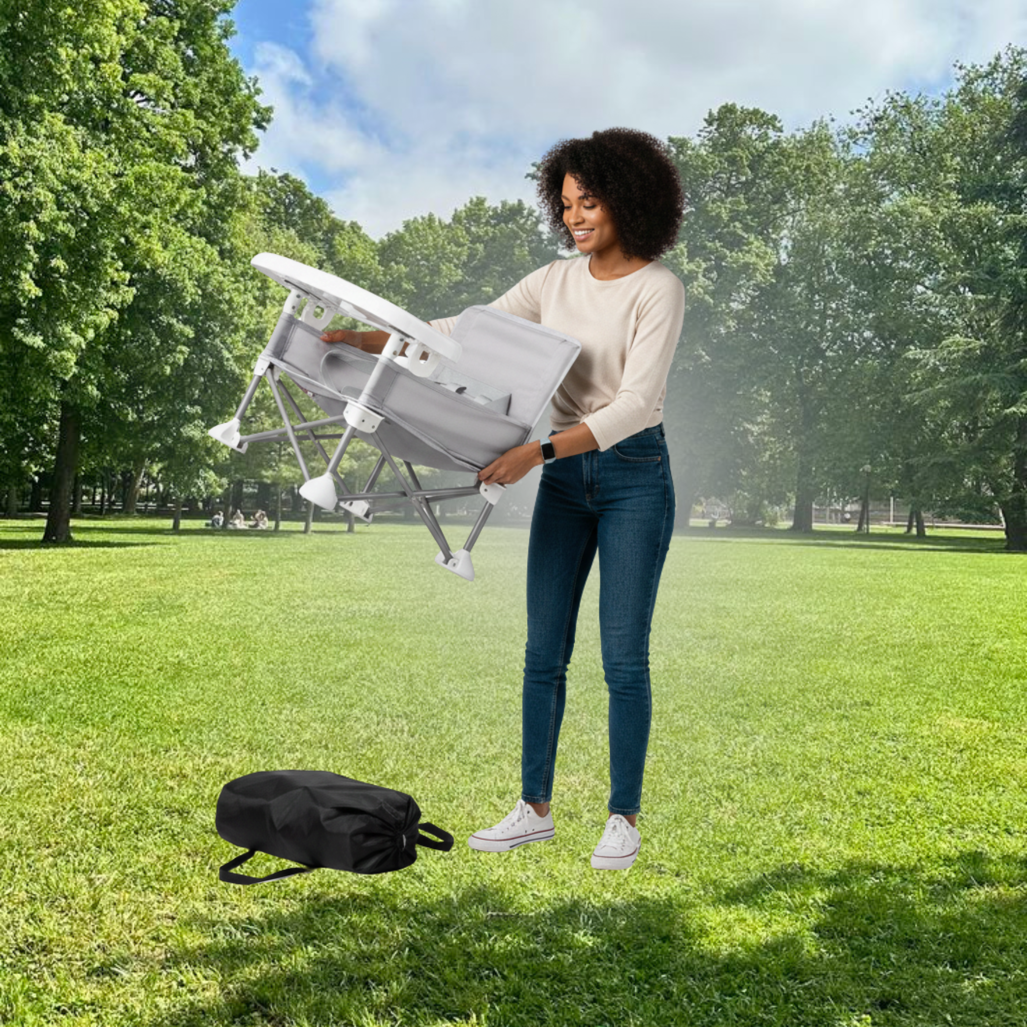 Es extremadamente compacta. Gracias a su diseño de plegado innovador, la silla se reduce a un tamaño mínimo y cabe perfectamente en la bolsa de transporte incluida. Es ideal para llevar en el maletero del auto, debajo del cochecito o incluso como equipaje de mano en viajes familiares.